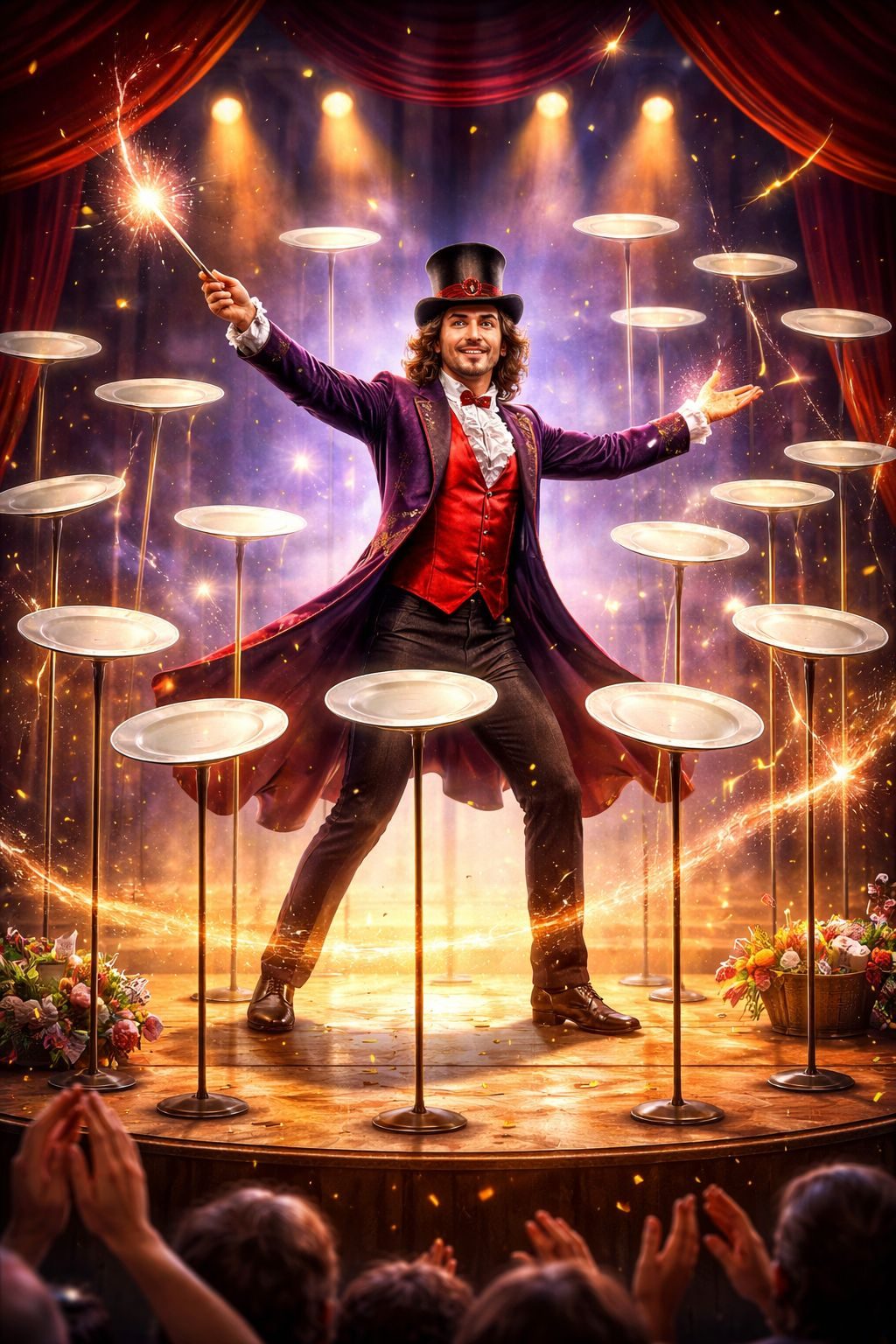 This is reminiscent of the stage performance of the magician who keeps multiple plates spinning on upright poles — but of course in this case there are many more "plates" involved. All of these are required to maintain their assigned place, otherwise a cascade effect will destroy the entire impressive arrangement.